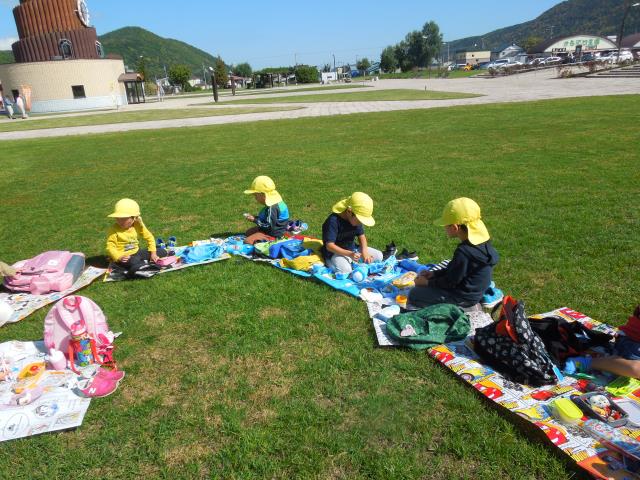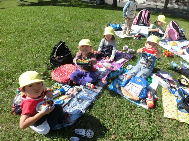 その後、天気も良く気持ちの良いお外で、お母さんの手作りのお弁当をお友達と見せ合いながら食べました。
