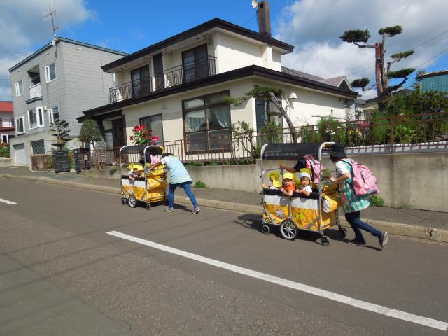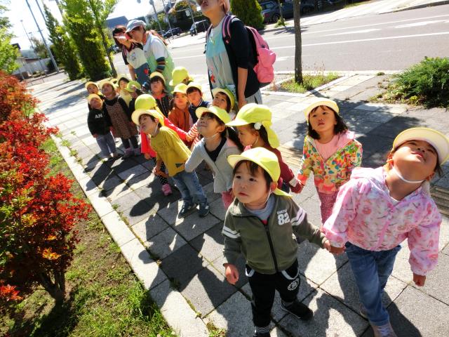 今日は秋晴れの下、歩けるお友達は、保育教諭と手をつないで園周りをお散歩してきました。