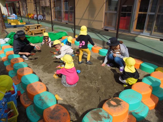 砂場では大きな山作りに挑戦!1回目は崩れてしまいましたが、2回目はみんなで力を合わせて大きな山が出来、大成功!!