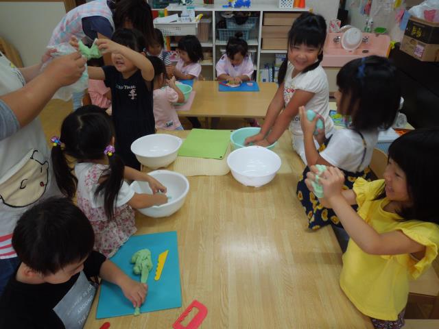 型抜きで「動物」などを型取ったり、それぞれ思い思いに好きな物を作り感触を楽しみました。