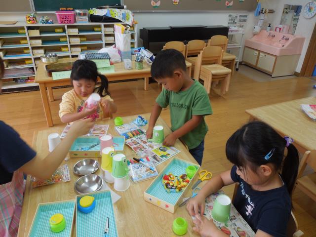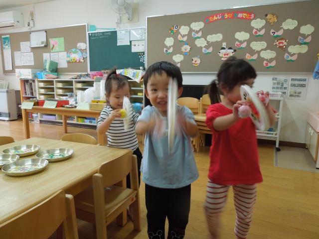 園内では紙皿を使って「くるくるこま」作りや、紙コップで「ロケットかえる」を作り、出来上がった物を見せ合って楽しんでいましたよ。