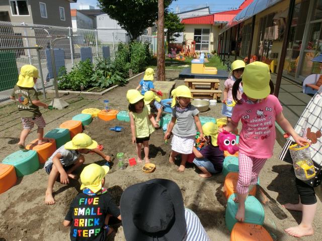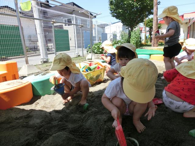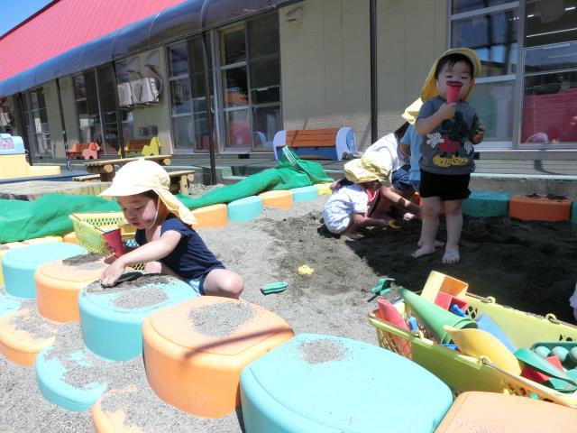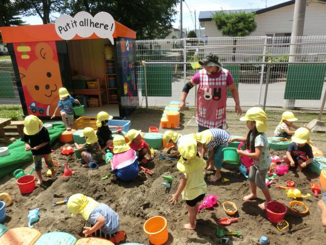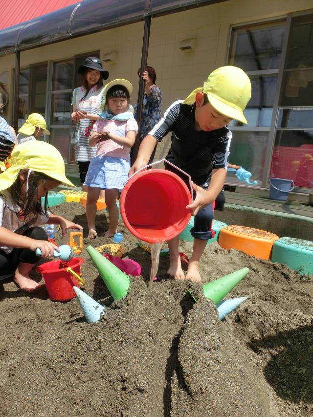 砂場では水を使って砂を濡らし、山やダムを作り水を流したり、池を作って遊びました。