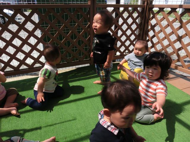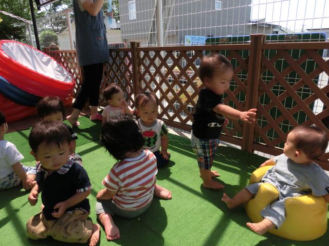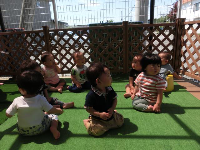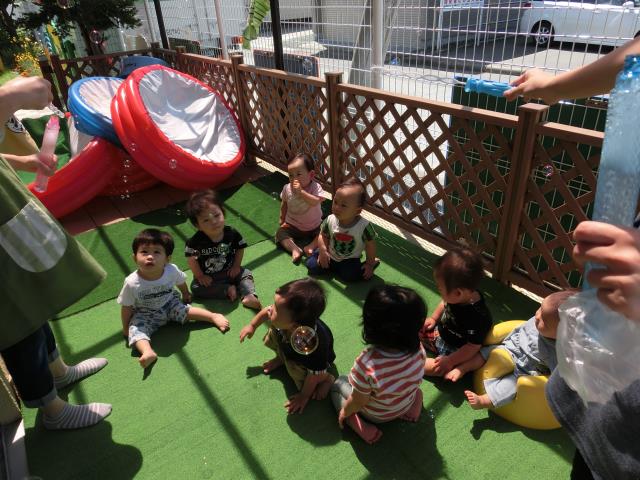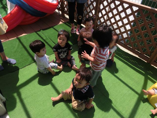 ひよこ組さんはテラスで‟しゃぼん玉”を見て楽しみました。