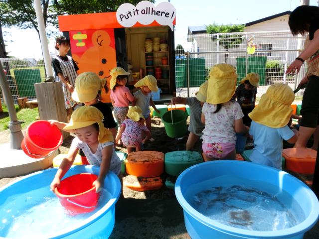 たんぽぽ組さんは、砂場で‟どろ水あそび”をしました。