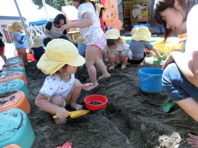 型抜きでアイスクリームを作ったり、お山や川を作ったところに先生方が水を流すと「おぉーー‼」と喜んだり。