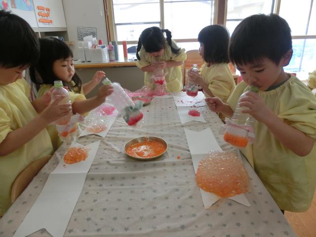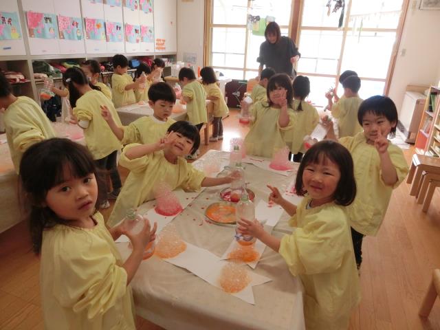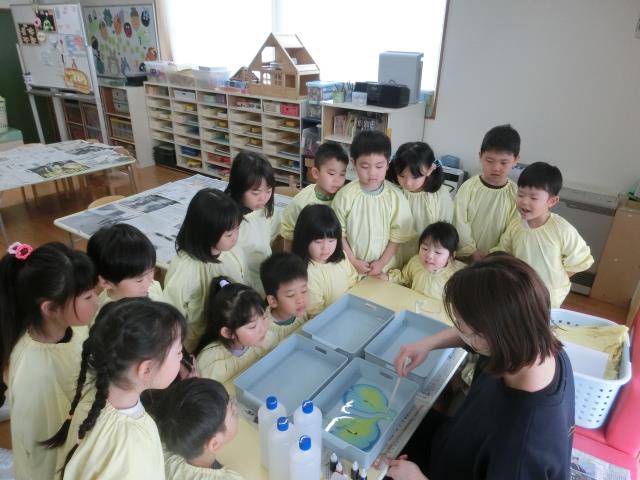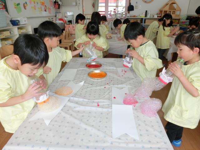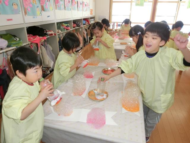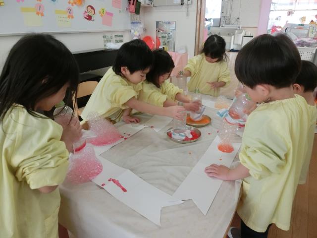 昨日から取り組んでおり、マスキングテープ、クレヨン、絵具を使ってのはじき絵は昨日行い、今日は色水としゃぼん玉液を使って「バブルアート」に挑戦をしています。