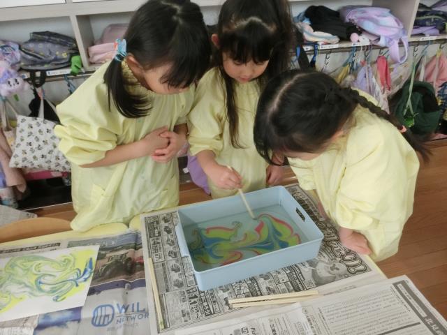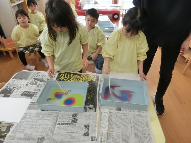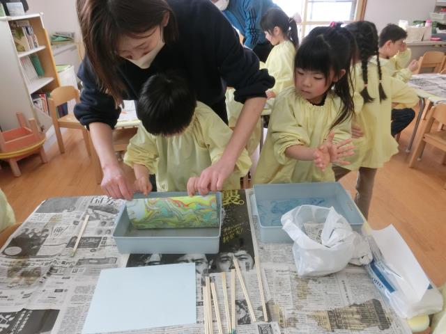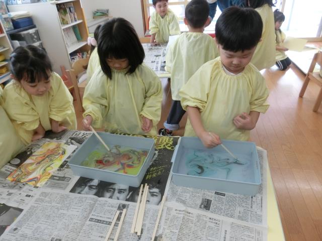 ‟マーブリング”という技法で、こいのぼりの模様をつけています!!