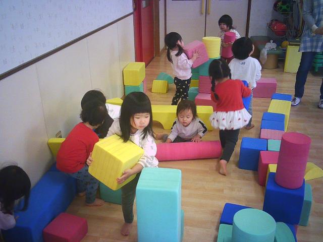 前回遊んだ滑り台・大型カラー積み木に加え、今日はサーキットも使って遊んでいます。