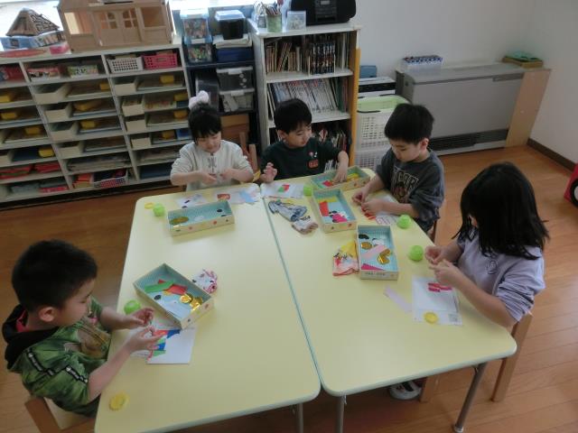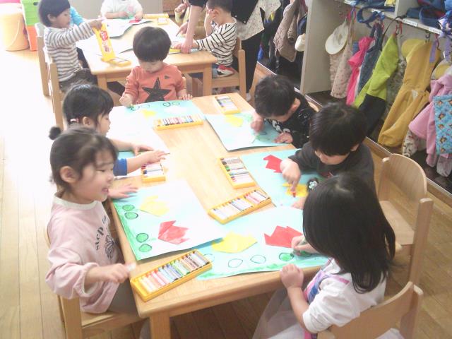 今日のちゅうりっぷぐみは、昨日まで行ってきた製作の仕上げで、クレヨンでお天気を描き入れています!