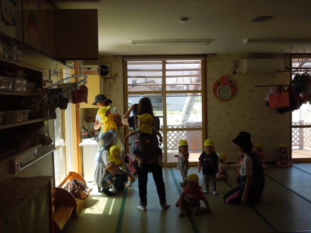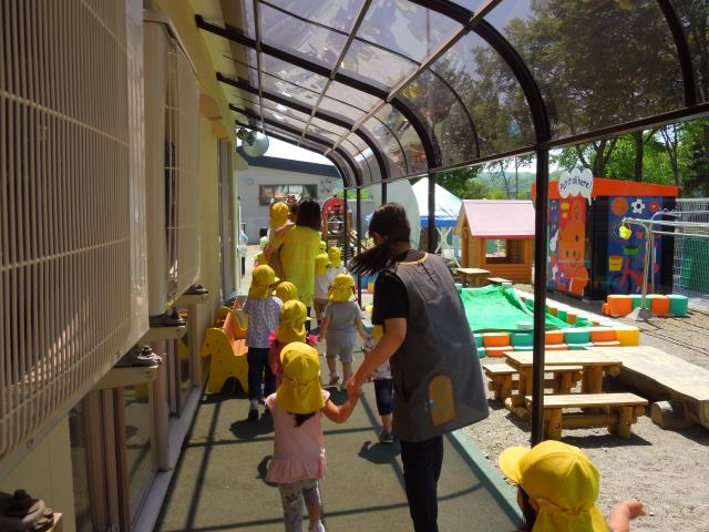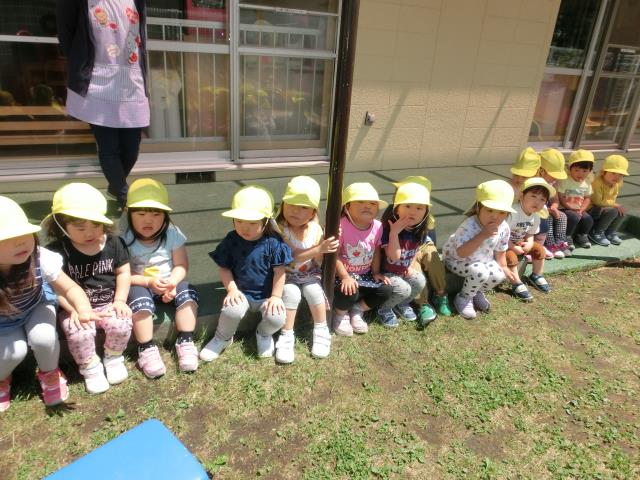 初めての園庭への避難なので、放送で注意事項を聞いてから避難しました。
