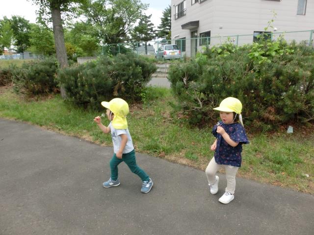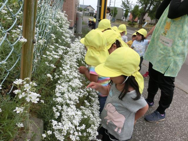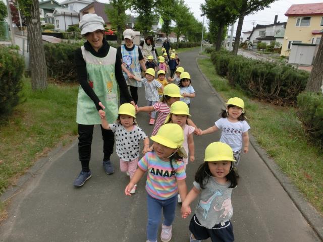 たんぽぽ組は園の周りから遊歩道まで、お散歩をしてきました。