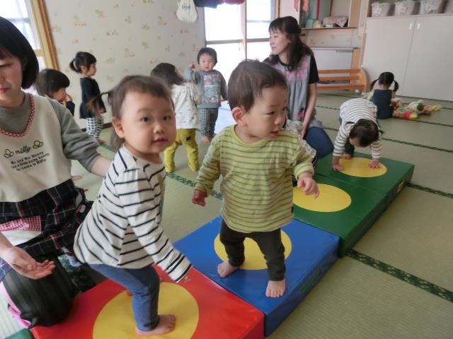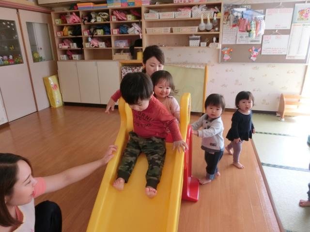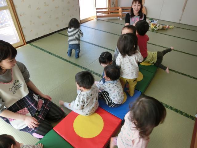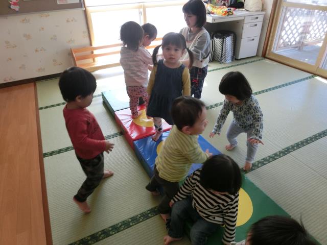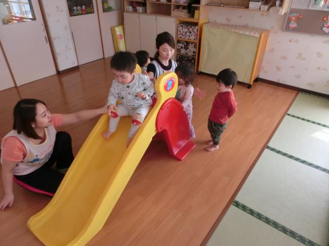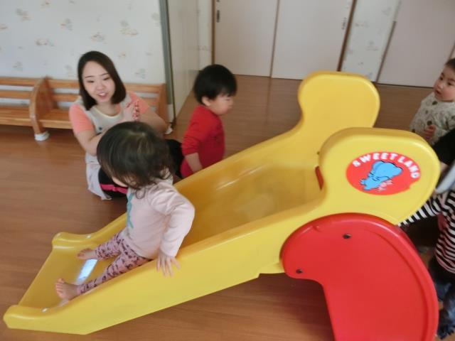 つくし組さんは、お部屋でJPクッションとすべり台で遊びました。
