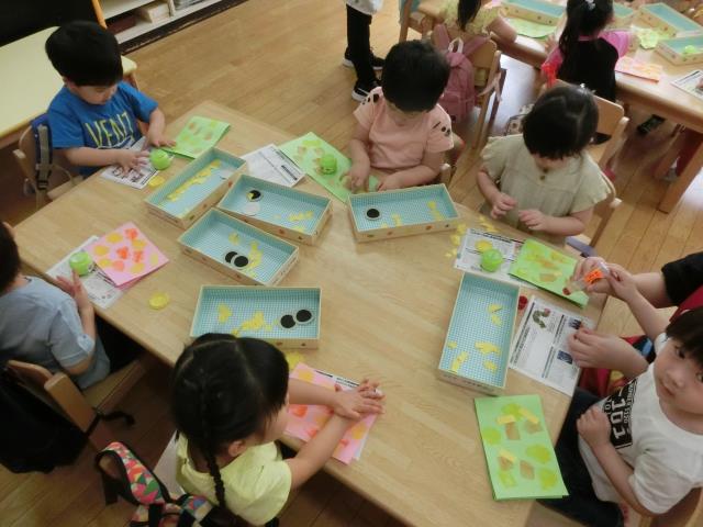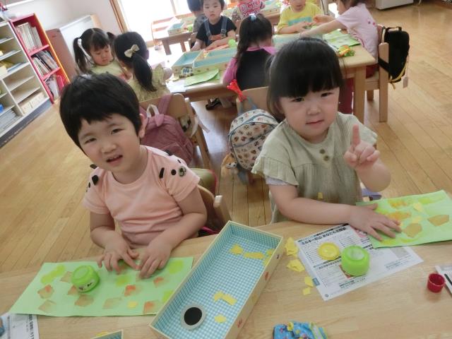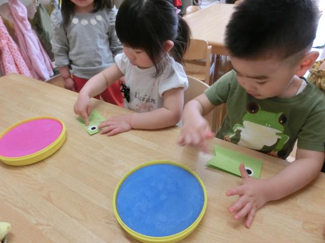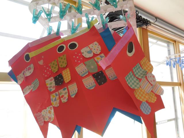 お母さんこいのぼりは、目とうろこは得意のシ-ルで貼り付け、子どもこいのぼりのうろこは、指スタンプで行いました。