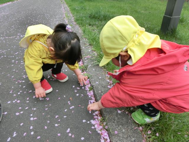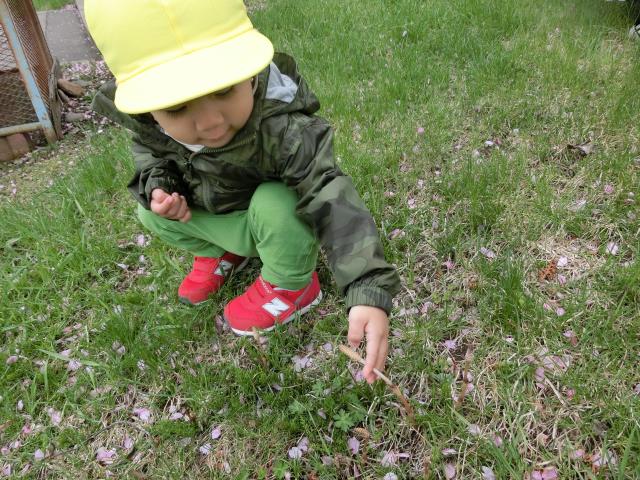 キレイな”桜”を見上げた後、初めて見る”つくし”を触ったり、桜の花びらを拾ったりして、見ていましたよ。