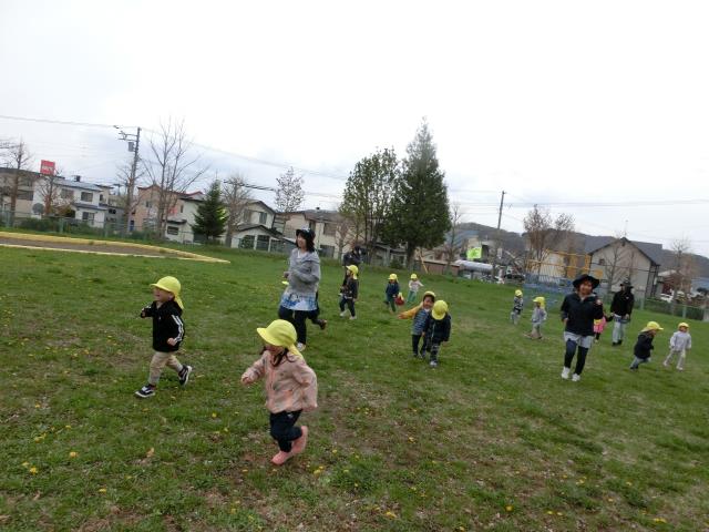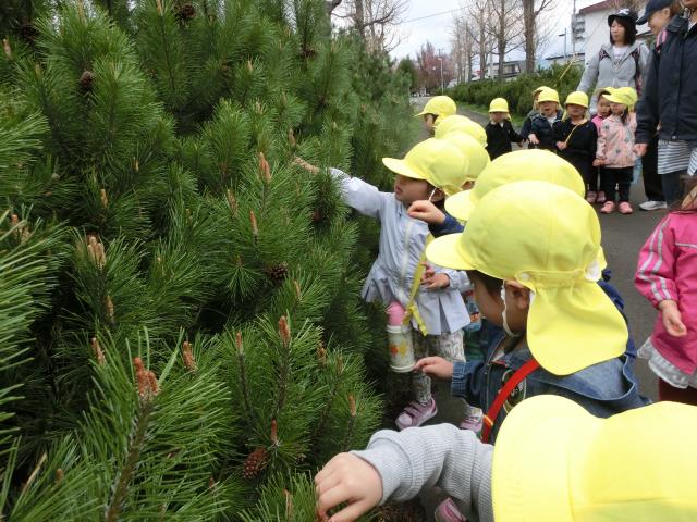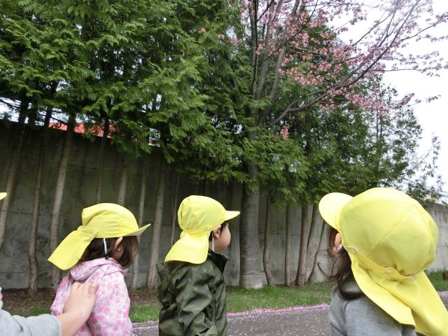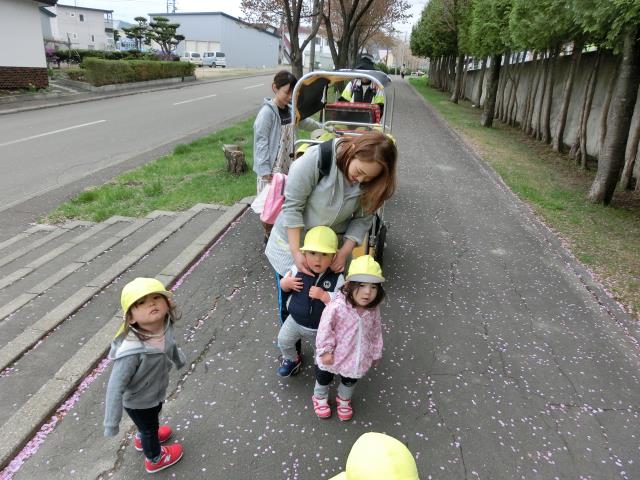 その後、水たまりをのぞいたり、近所のチューリップを見て楽しみ、思わず「さいた~♪ さいた~♪・・・」と歌い出す子もいましたよ。