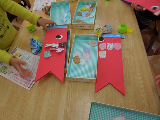 その後は、のりで”こいのぼり”にペタペタ貼って、ウロコにしましたよ。