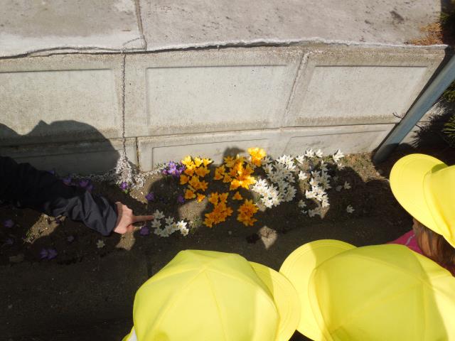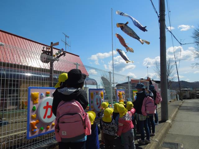 こいのぼりに「いってきます!」をしてから、クロッカスや ふきのとう を見たり、カラスや犬に あいさつをして楽しそうに歩いていましたよ。