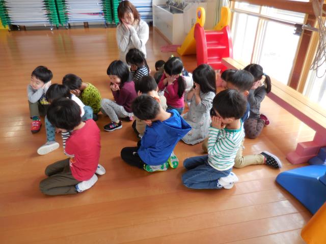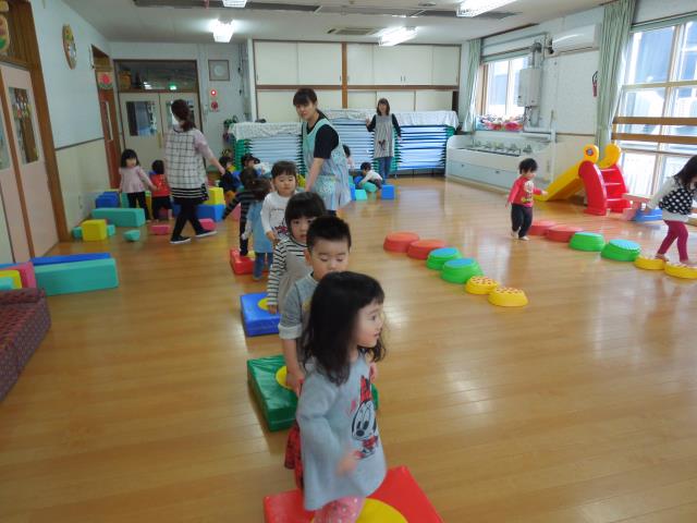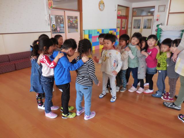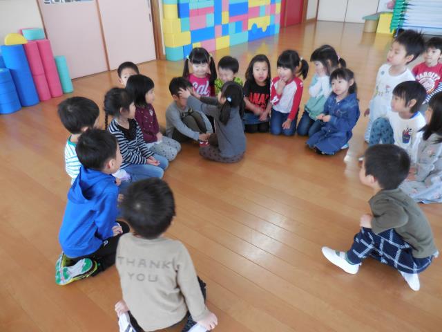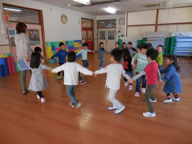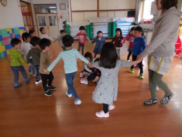 さくら組さんは、ホールで『かごめ』『かもつ列車』『あぶくたった』をしました。