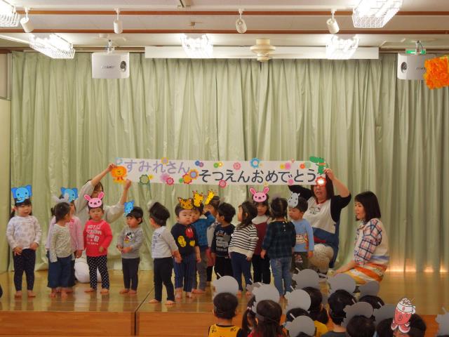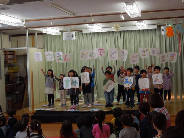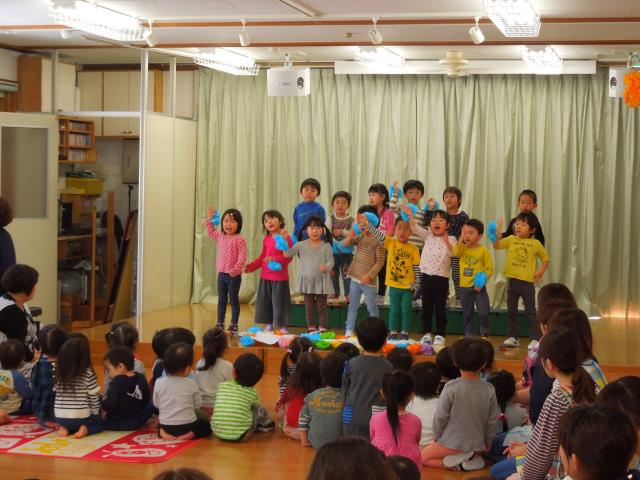 いつも優しく一緒に遊んでくれた、すみれさんの為に”ありがとう”の気持ちを込めて各クラスが踊りや歌、ペープサートなど披露しました。