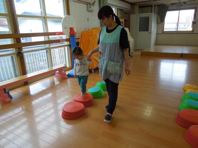 お天気の悪かった今日、たんぽぽさんはホールで体を動かして遊びました。