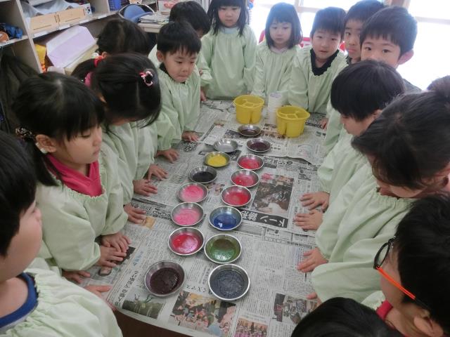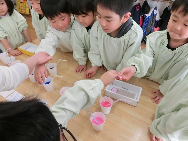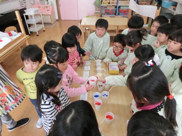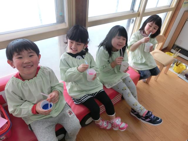 さくら組さんは、氷を作ったお皿に残った絵の具を使い『ジュース』を作りました。