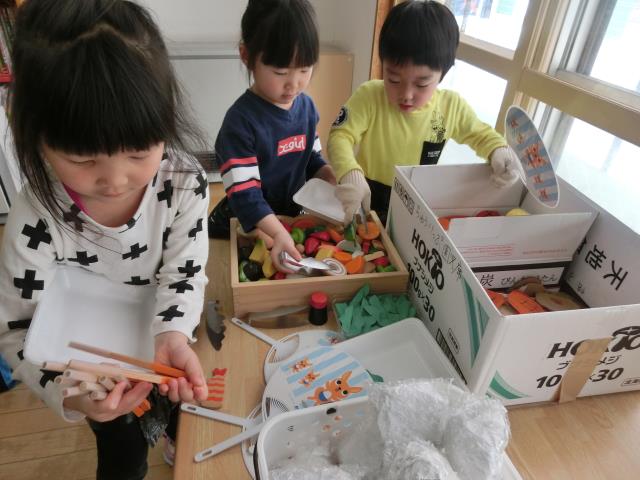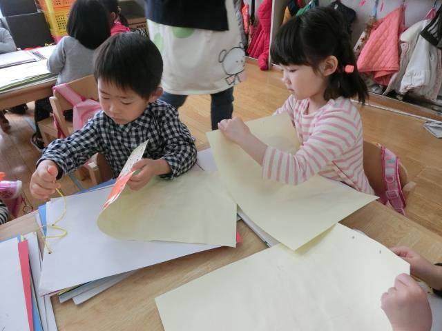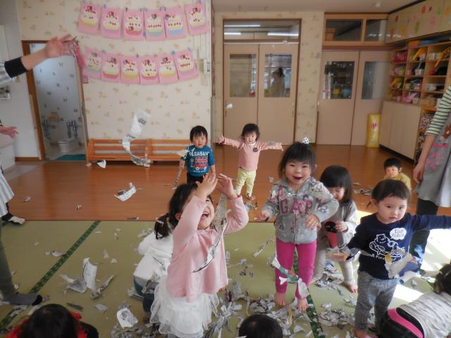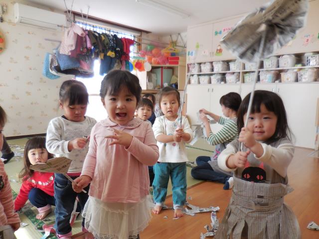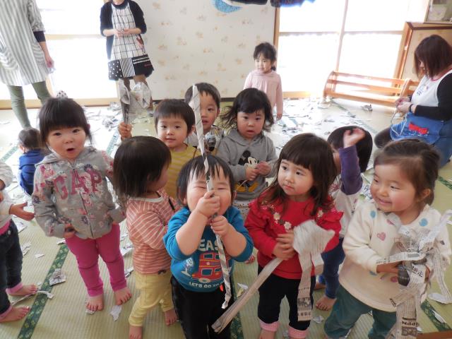 先生に棒や傘を作ってもらったり、小さくチギチギした新聞を降らせてもらったり。