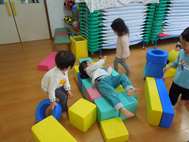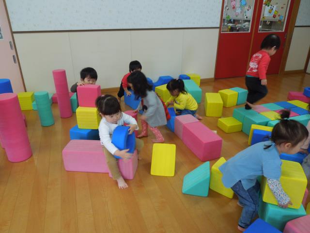 JPクッションでピョンピョン跳ねたり、丸い足場を落ちないように歩いたり、カラー積み木で車やベッドを作って遊んだり。