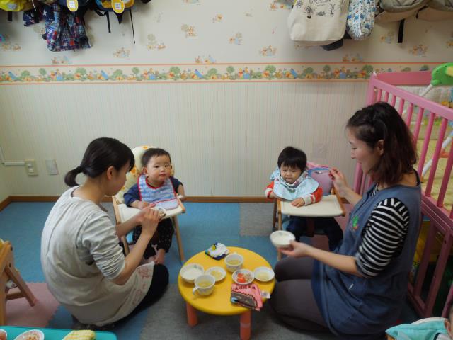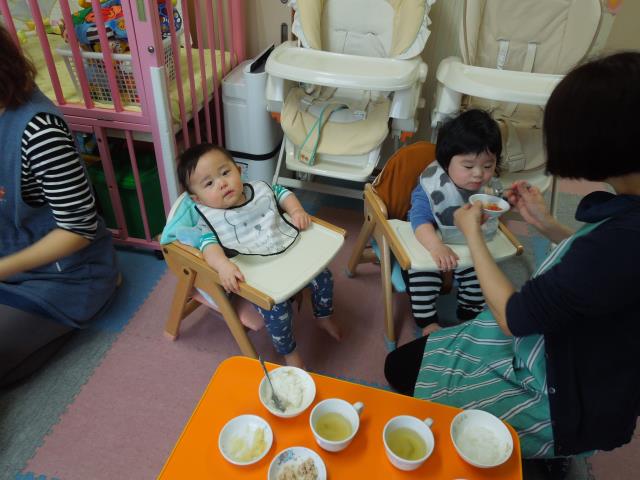 みんな泣くこともなく、先生たちがスプーンに食べ物を乗せてお口の前にもっていくとパクリ!