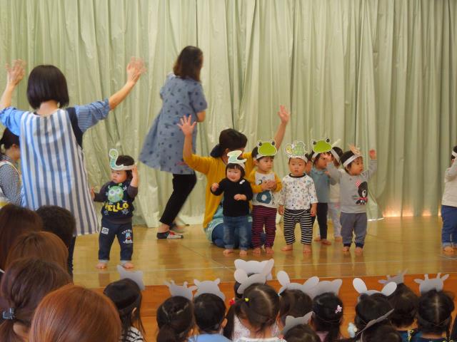 ひよこ・つくし・たんぽぽさんは緊張しながらも踊りを見てもらい、ちゅうりっぷさんはすみれさんのお遊戯会の練習風景をみて楽器と手話に挑戦。