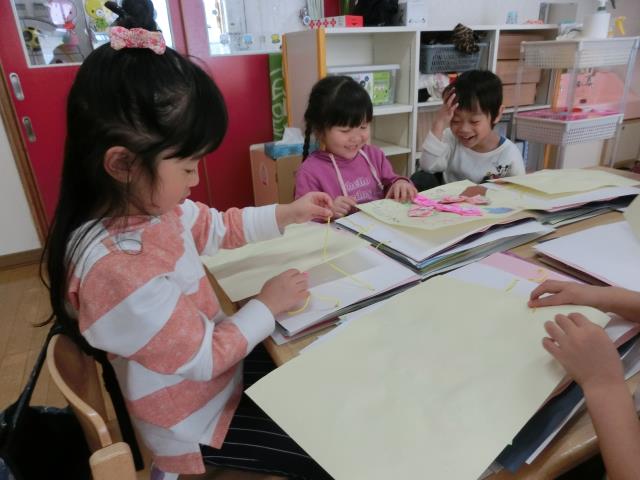 1年ぐらい前の作品を見て「なつかし~~!」と言いながら綴る子、「???(これ作ったっけ?)」と、いう顔をして綴る子様々でした。