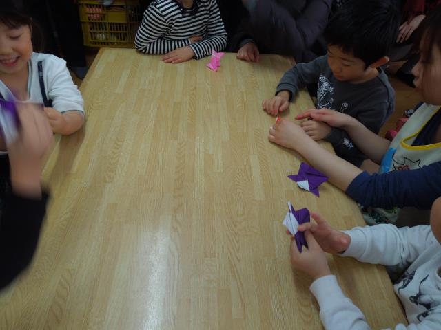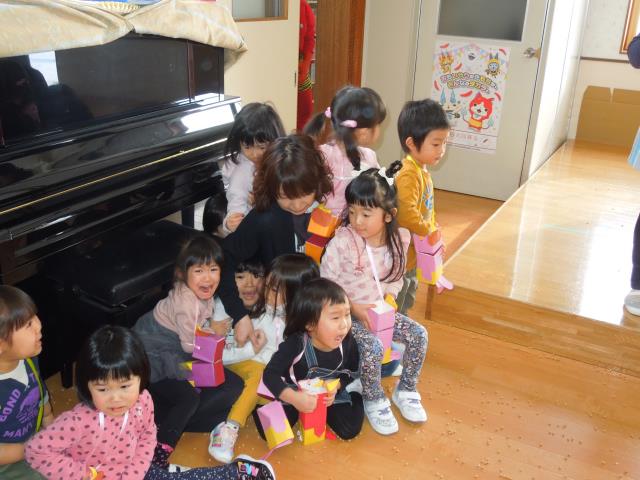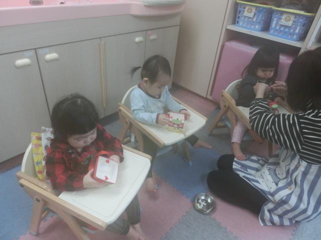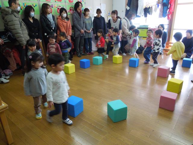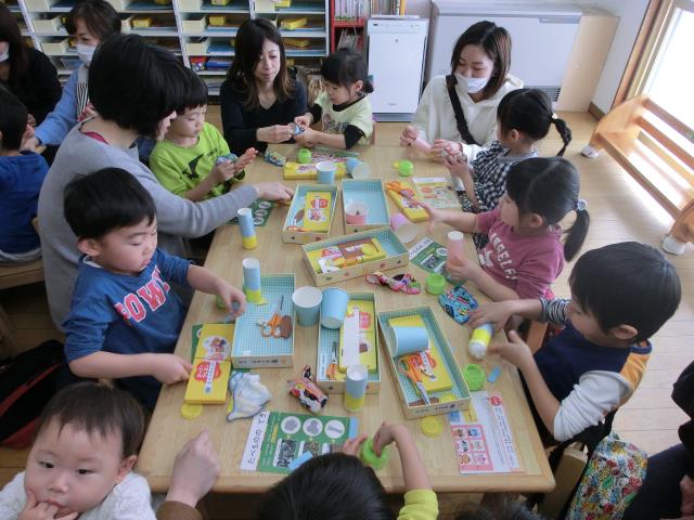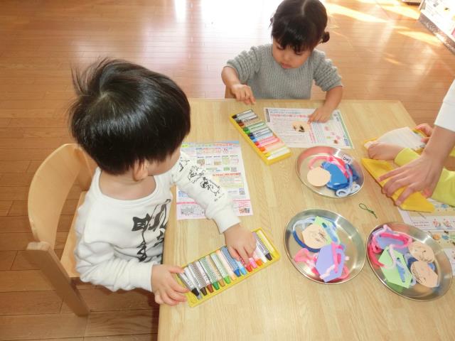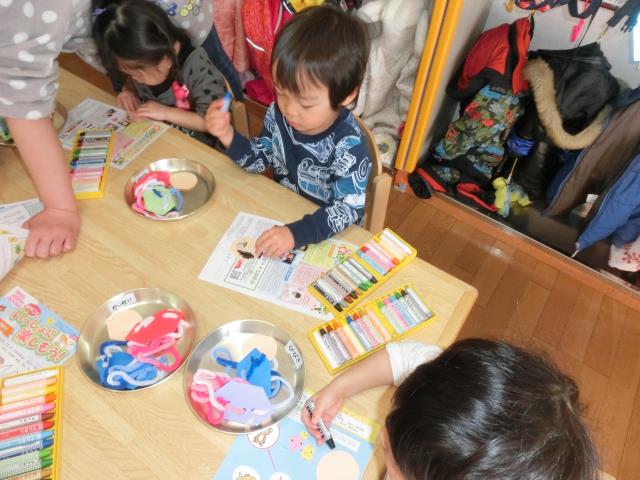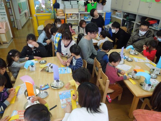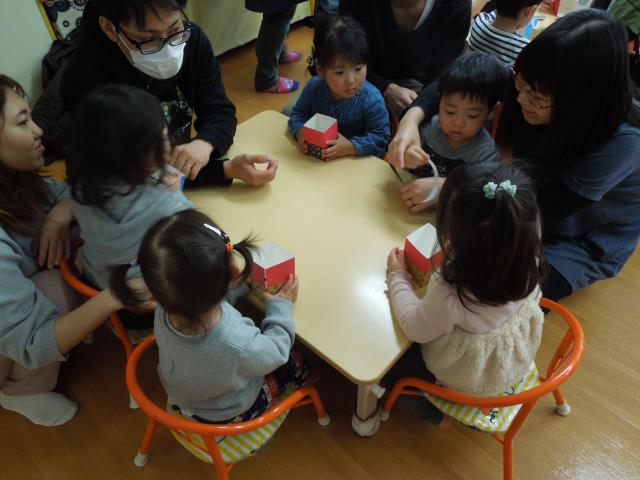 1歳児は、節分で使うマス作りをしてから子ども達の大好きなふれあい遊びを親子で行いました。