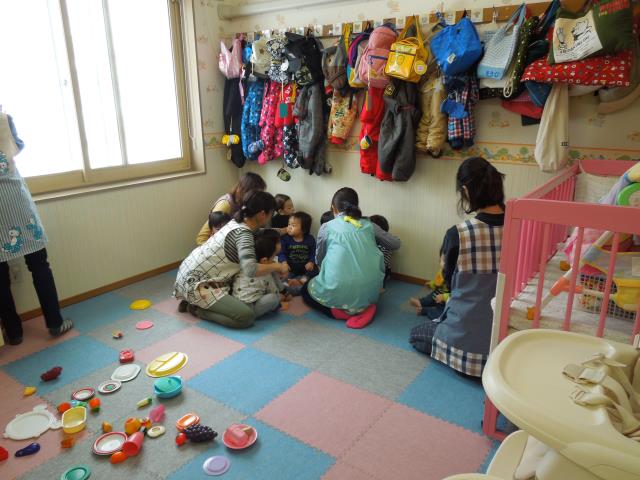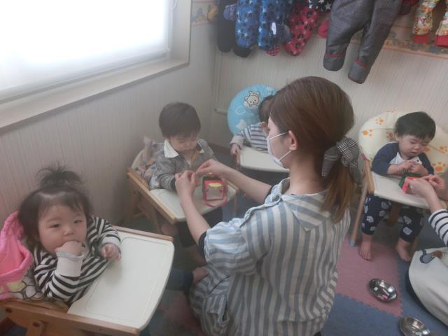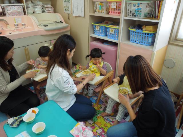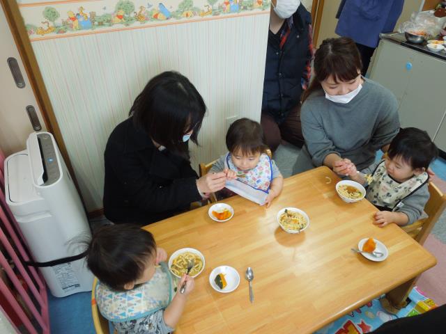 0歳児のお友だちは給食時の様子を参観してもらい、量・味などお家での様子も交えながら交流しました。