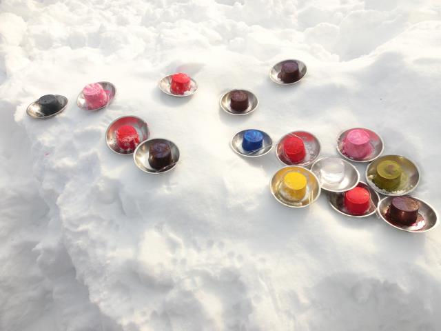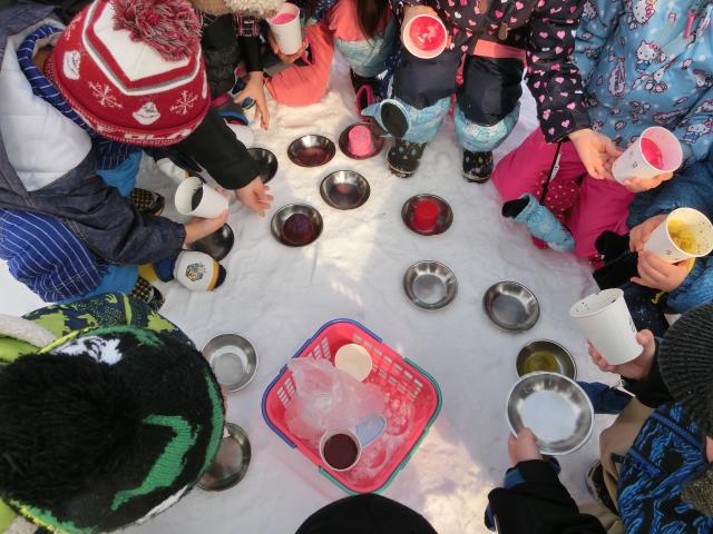さくらさんは、昨日 色水を外に置き、凍るかどうかの実験です。