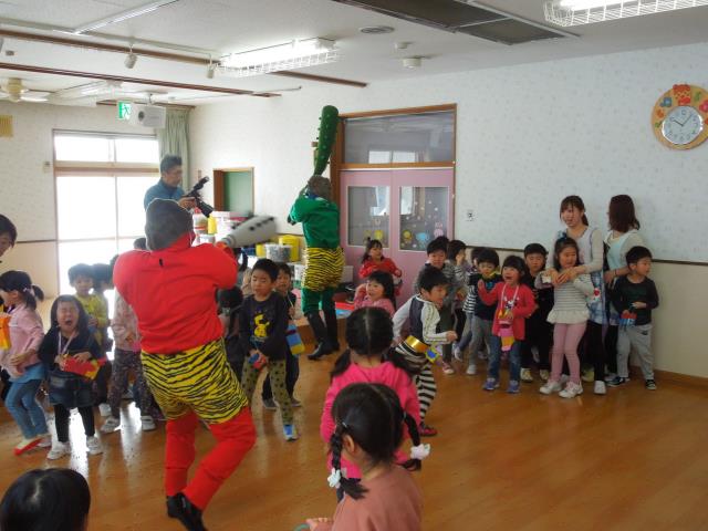ホールに2~5歳児が集まり、心の中にいるオニをやっつけました。