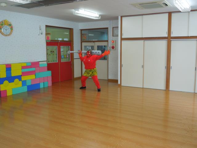 園長先生のお話の後、豆まきの歌を歌い、豆を投げる練習をしてから、どこからか太鼓の音が…。