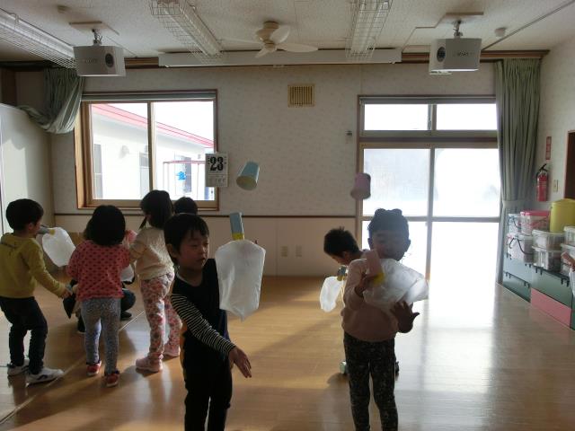 3歳児は鬼ロケットを作りホールで飛ばして遊びました。
