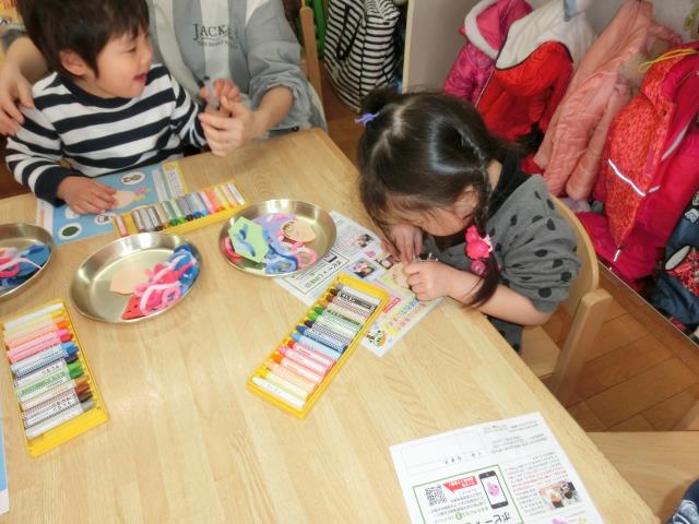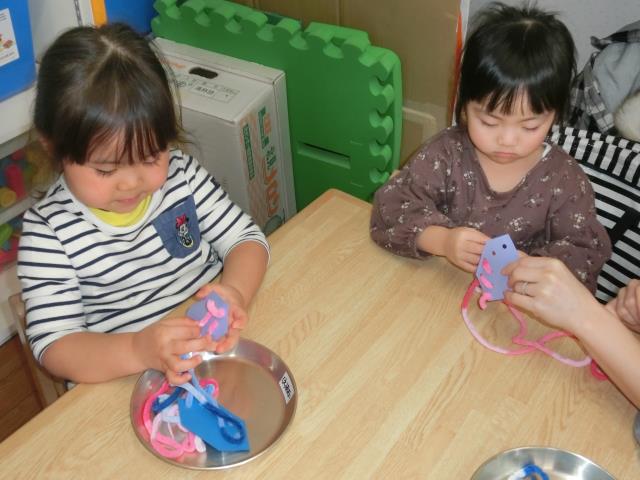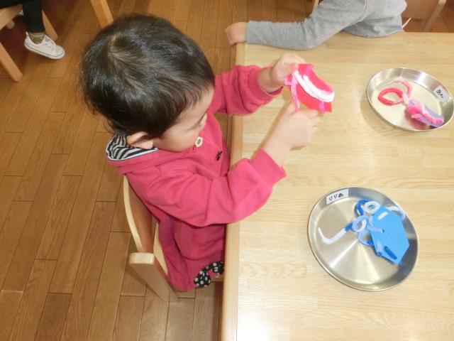 ”ひも通し”が大好きなみんなのため、”ひも通し”の作業を取り入れ、体の部分を作りました。