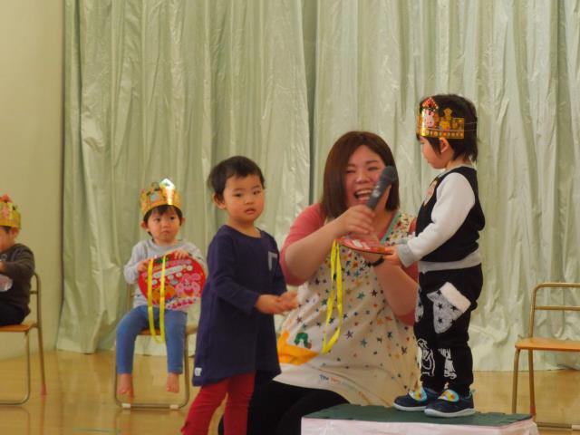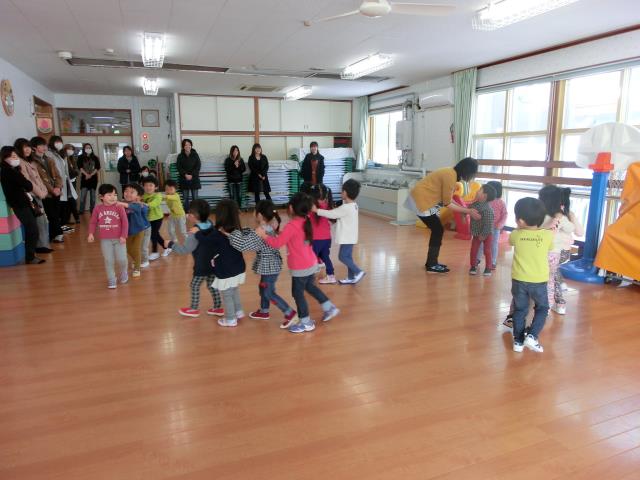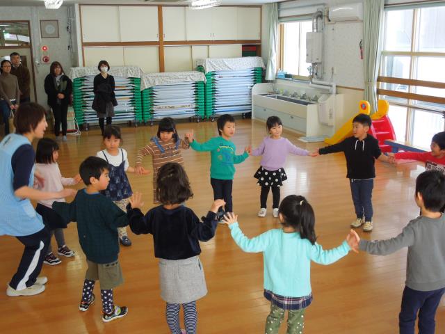 そして、ホールで”かちかち山”と”かごめかごめ”で楽しみ、後ろの正面を当てる際、目隠しをしてお友だちの顔を触って当てる所は難しかったけどみんなクスクス笑って楽しんでいましたよ!