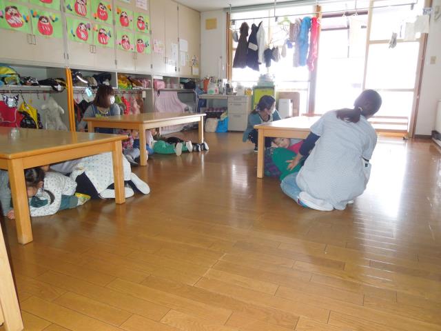 放送でのお話をしっかり聞いていたので慌てる事なくスムーズにテーブルの下や天井に電気がない所の壁にくっついたりして身を守りましたよ。