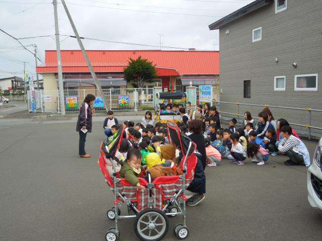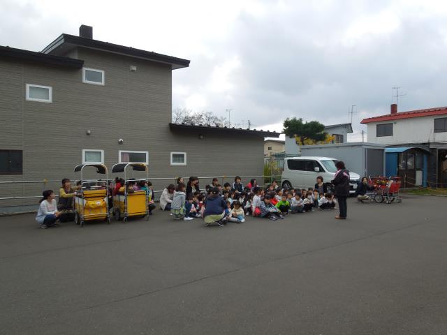 いつもは園庭に避難しますが、ひまわりさんからの出火なので、園前の駐車場へ逃げました。
