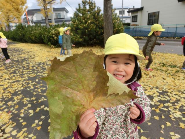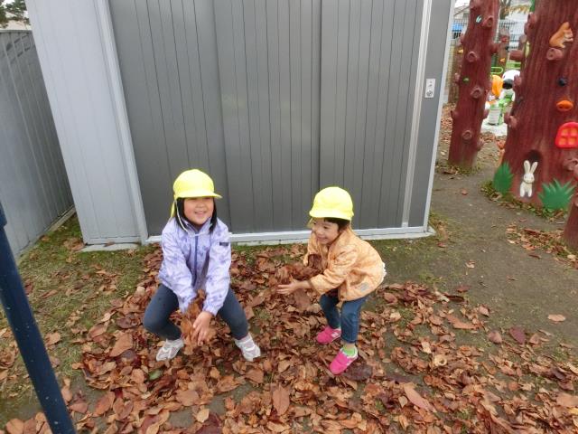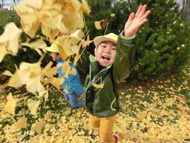 一面の落ち葉の中を歩いたり、走ったり、落ち葉を拾って投げ上げてみたり、みんな大喜び!