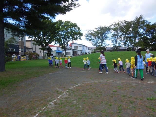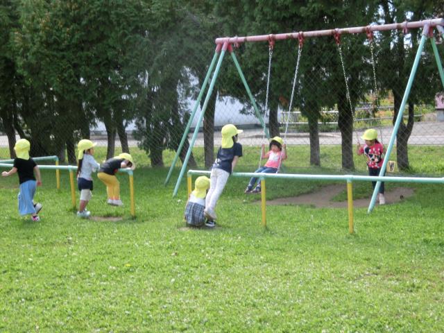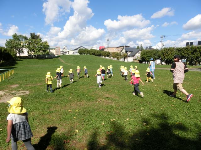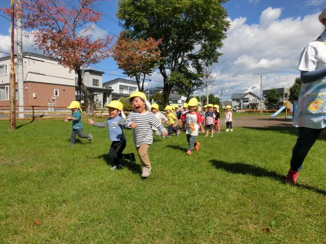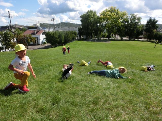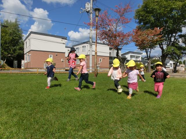 すべり台やブランコ等で遊んだ後、草原に行って男女に分かれて、よーい ドン‼