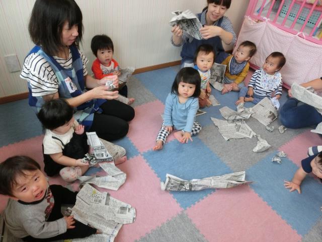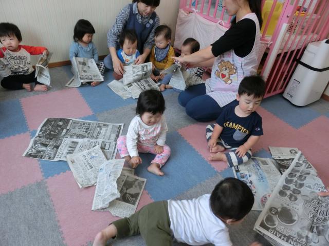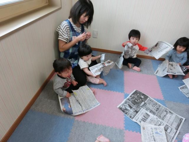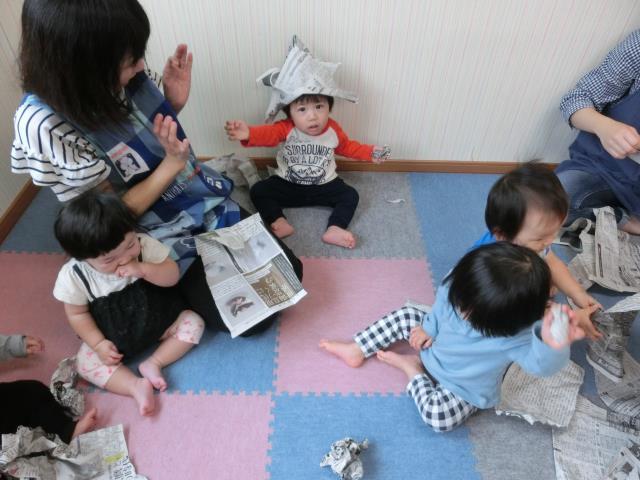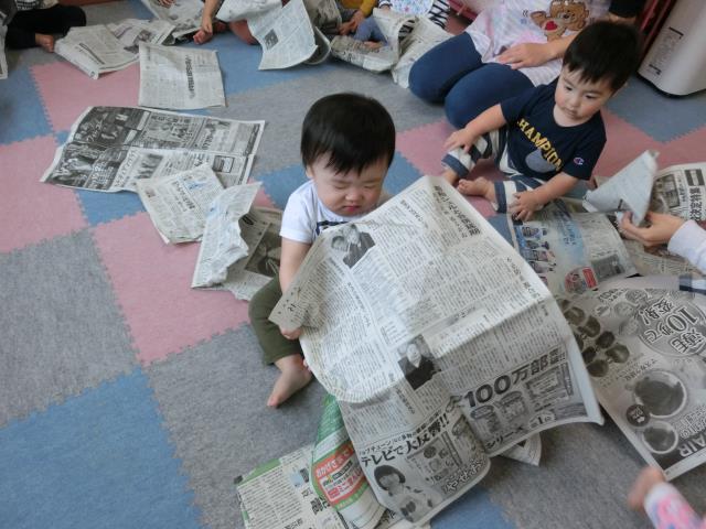 今日の ひよこ組さんは、新聞紙で遊びました。
