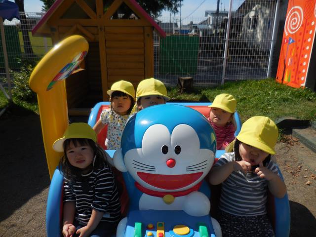 ドラえもんに乗ったり、すべり台・木製遊具・ログハウス等々、思い思いの場所でたくさん体を動かして遊びました。