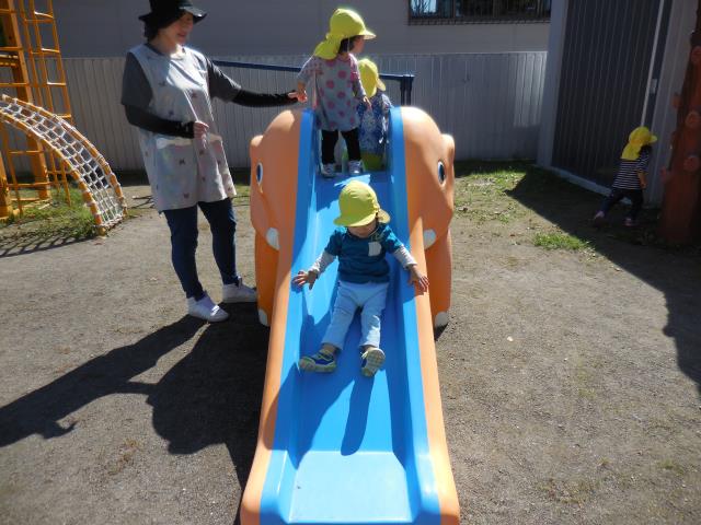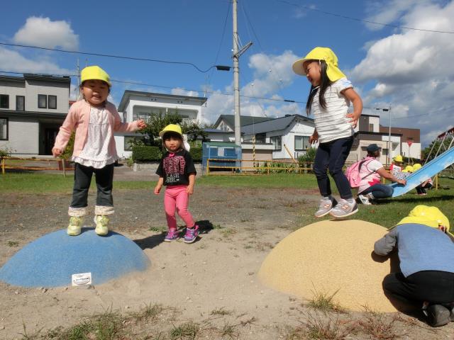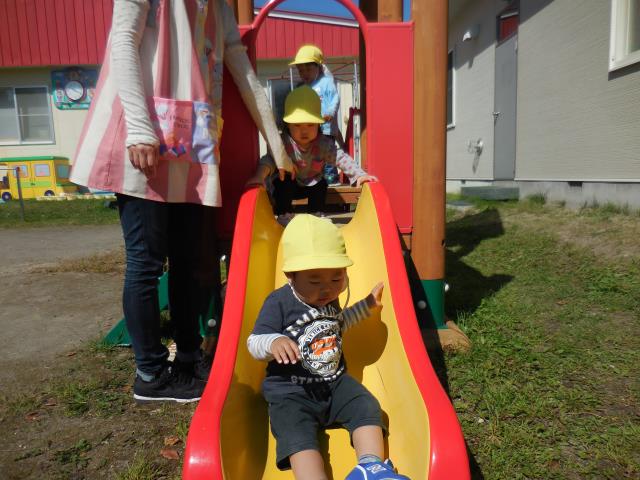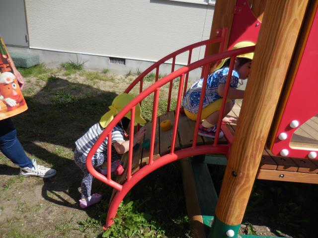 固定遊具で遊んだり、坂を転がっておりたり、思い思いに動き回っていた子ども達。