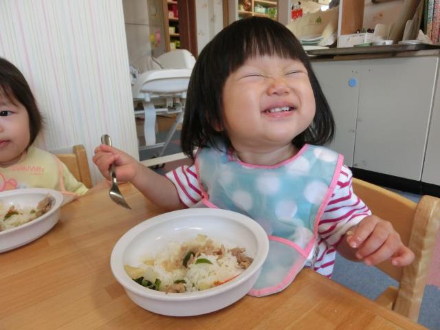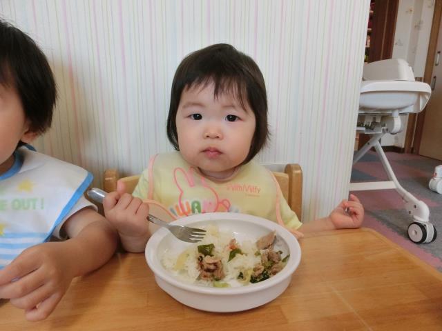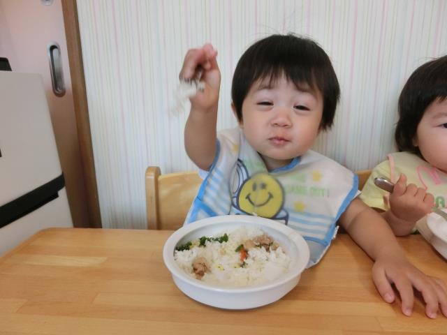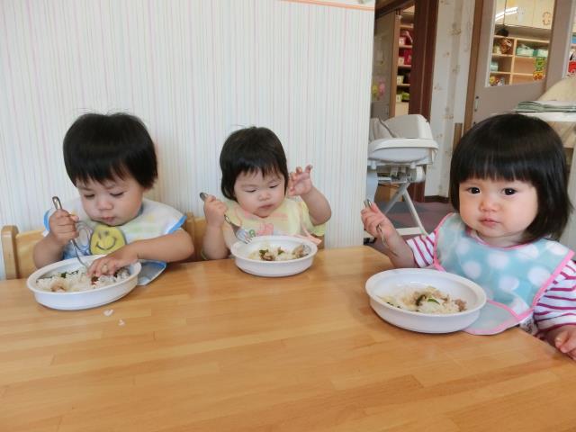 ひよこ組では、今日から3人のお友だちが大きい組さんと同じ幼児食になりました。