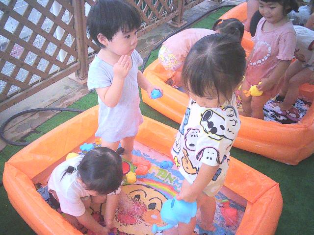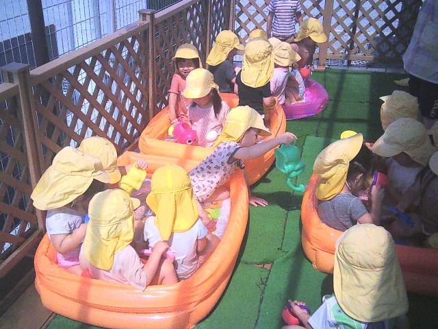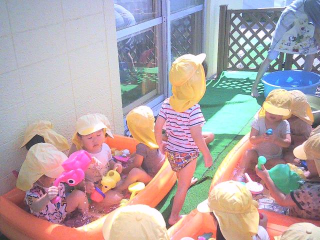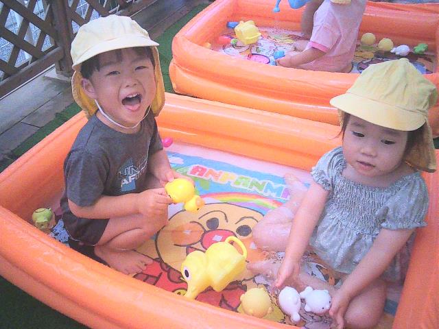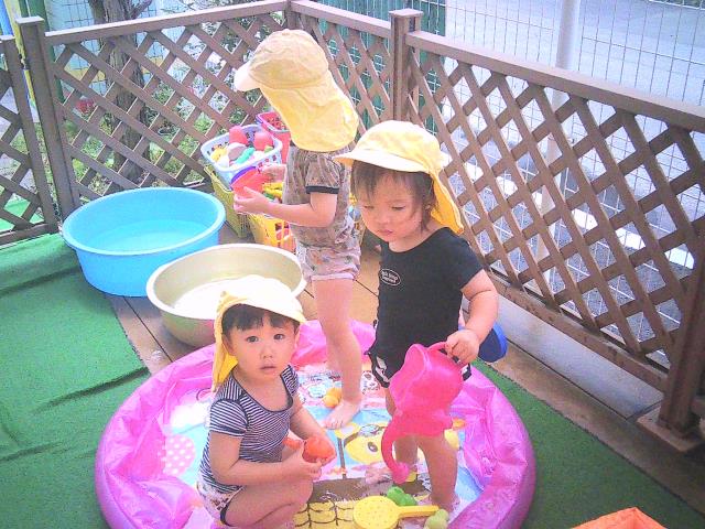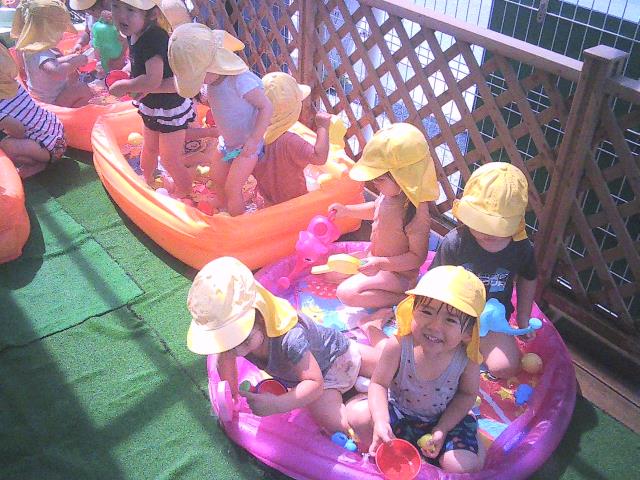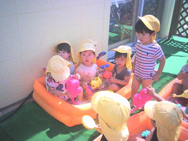 温水の感触を楽しみながら、ジョウロや水用玩具を使い、楽しんでいた子ども達です。