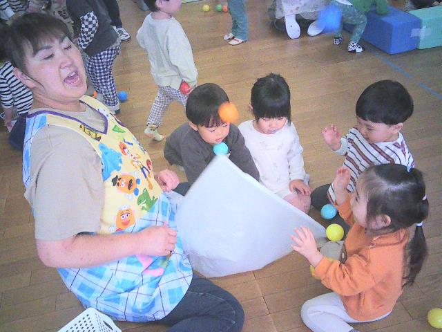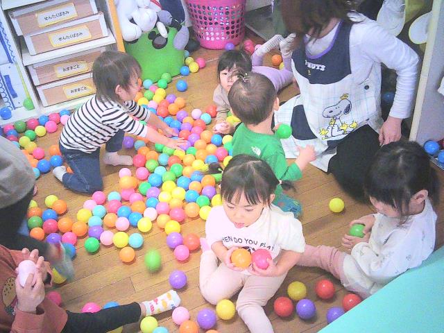 今日のたんぽぽぐみは、お部屋でカラーボールを使って遊んでいます。