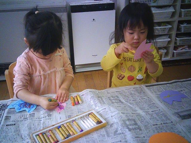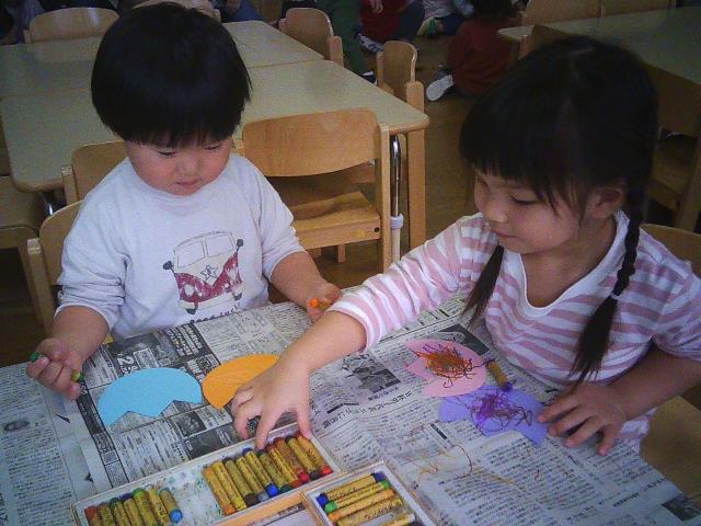 ピンク、うすむらさき、オレンジ、水色の4色の中から自分で好きな色を選び、クレヨンを使って色を付けたり、模様を描いたりとのびのび取り組んでいました。