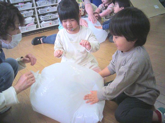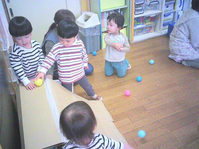 ボールプールやダンボールのコロコロ坂、ビニール袋を使ったジャンプボールなど…盛り沢山のボール遊びを楽しんでいます。